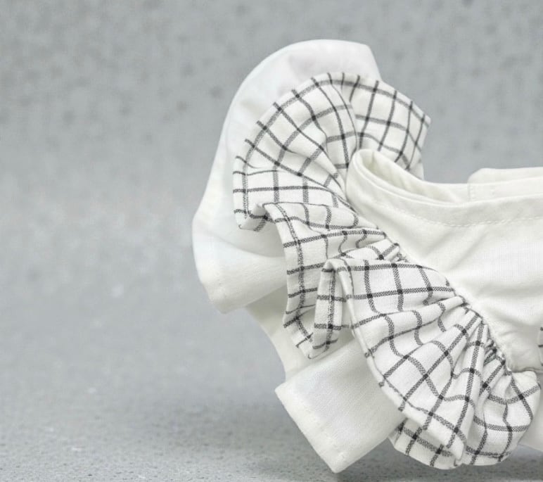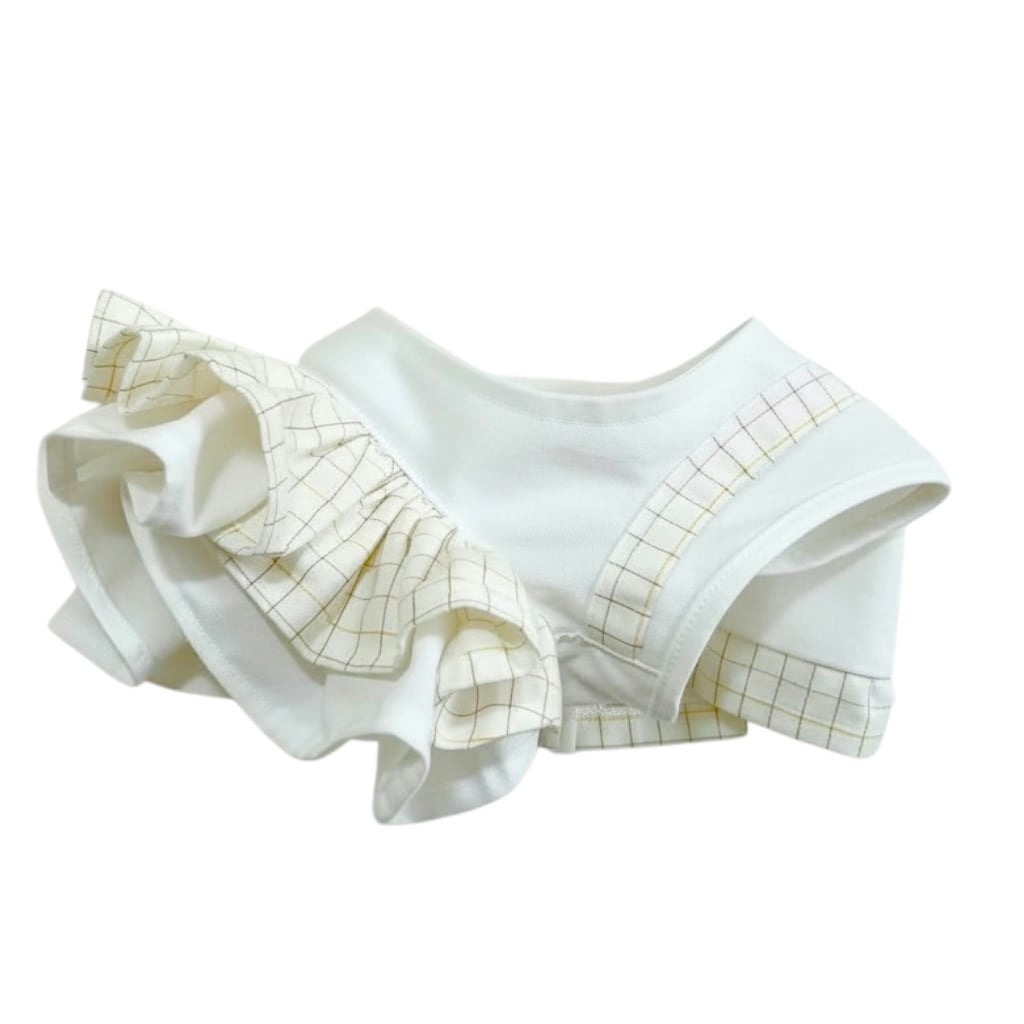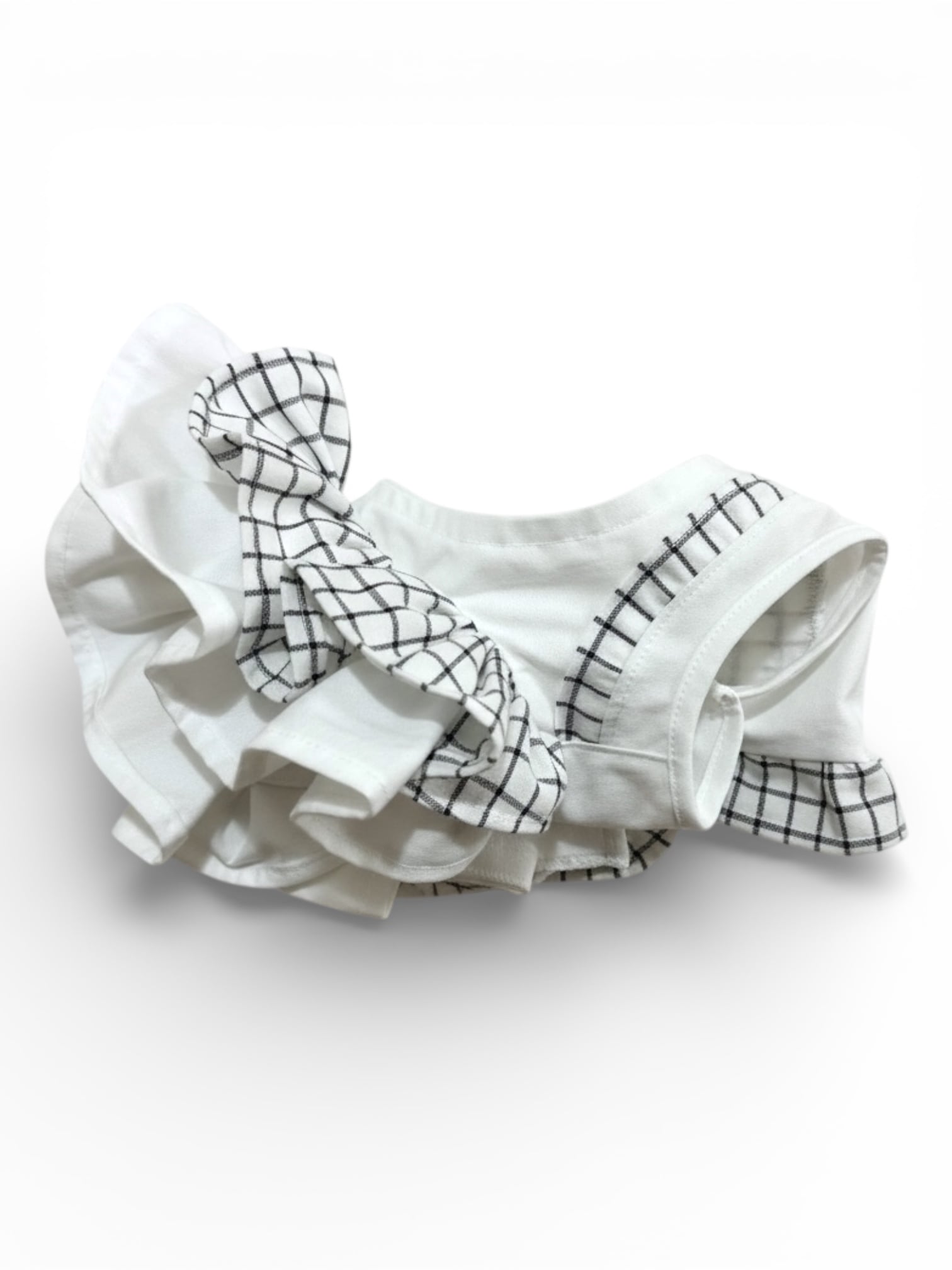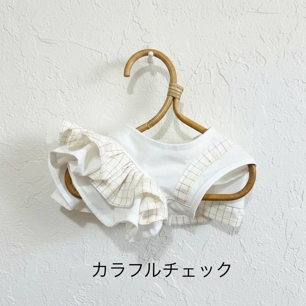 チェック柄とフリルが施されたデザインで、