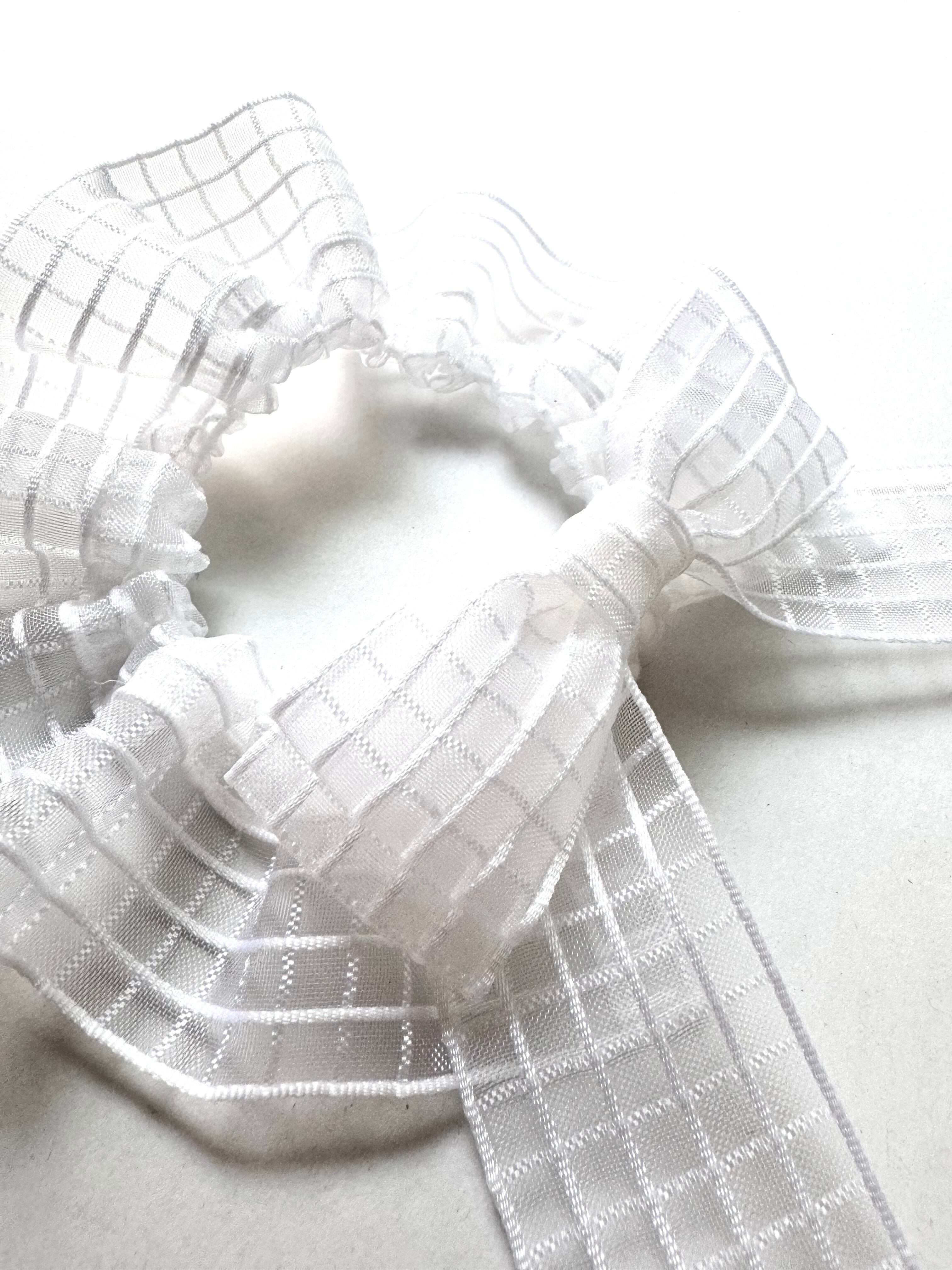 密度の違う糸が編み込まれたシアー素材のチェック柄リボン。