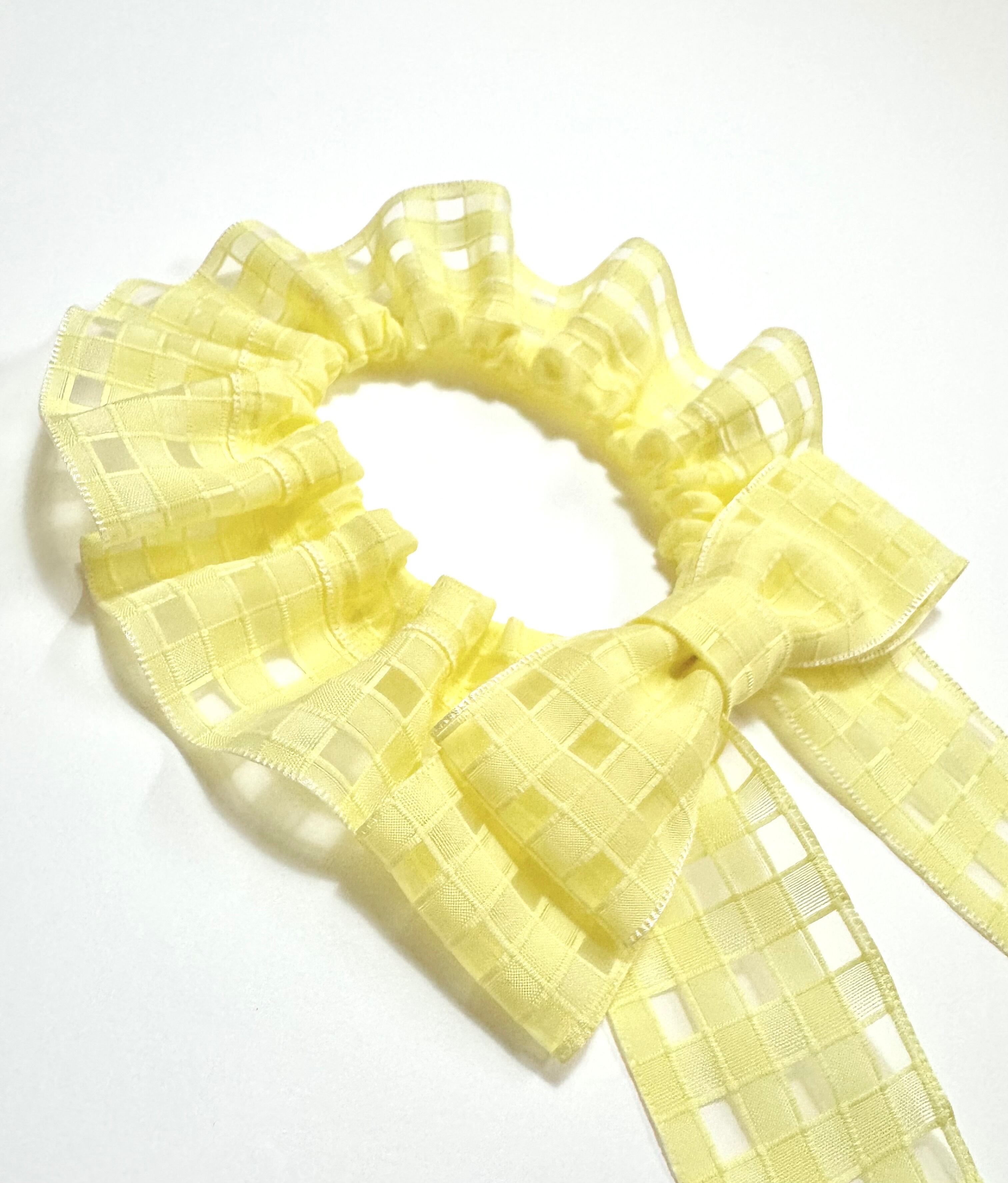 ハンドメイド ライトイエロー ブロックチェック シースルー リボン シュシュ 犬猫